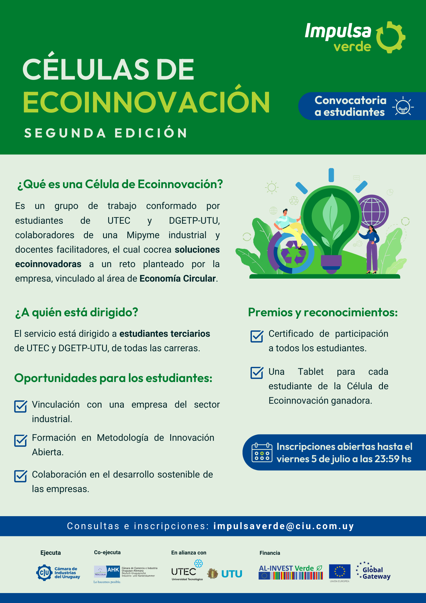 El Departamento de Jóvenes Emprendedores invita a estudiantes de Educación Terciaria, de todas las carreras, a formar parte de un grupo de trabajo junto a docentes facilitadores y colaboradores de Mipyme Industrial para crear soluciones a desafíos planteados por las empresas. Las inscripciones se recepcionan hasta el viernes 5 de julio a través del siguiente mail: impulsaverde@ciu.com.uy Las propuestas deben ser ecoinnovadoras y tener en cuenta la economía circular: sin impacto negativo en el ambiente, optimizar los recursos y minimizar la generación de residuos.
